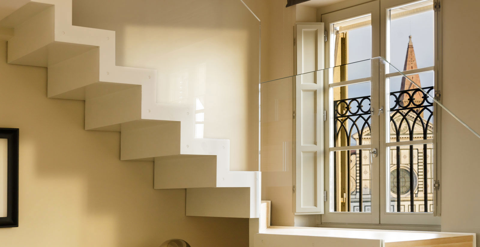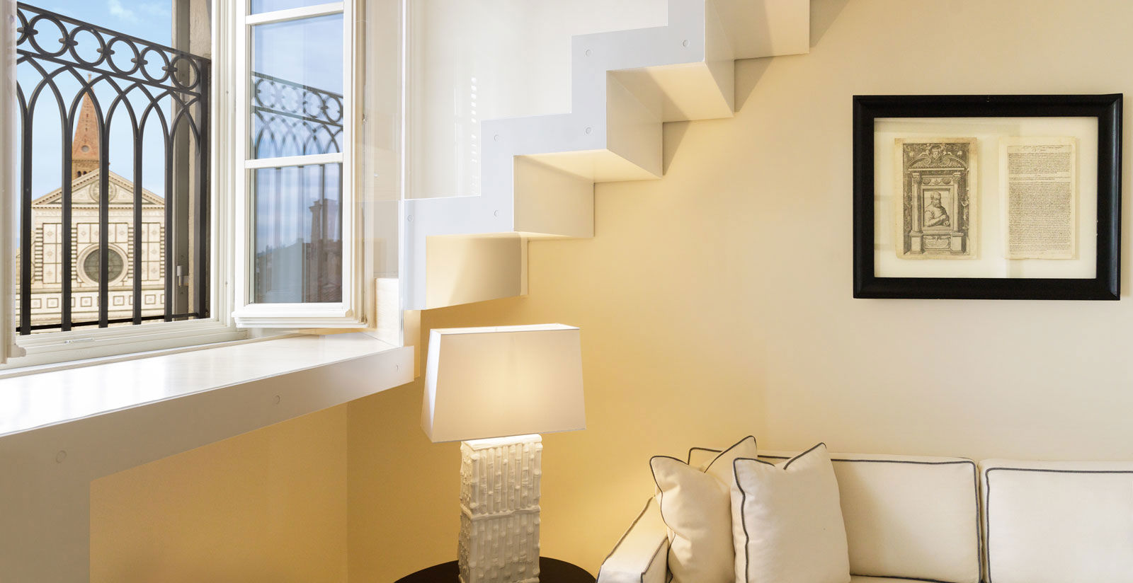 The hotel’s panoramic loft is a comfortable, light-filled space of around 50 square meters, draped over two levels and boasting a unique, front-row view of Piazza Santa Maria Novella and its namesake church.